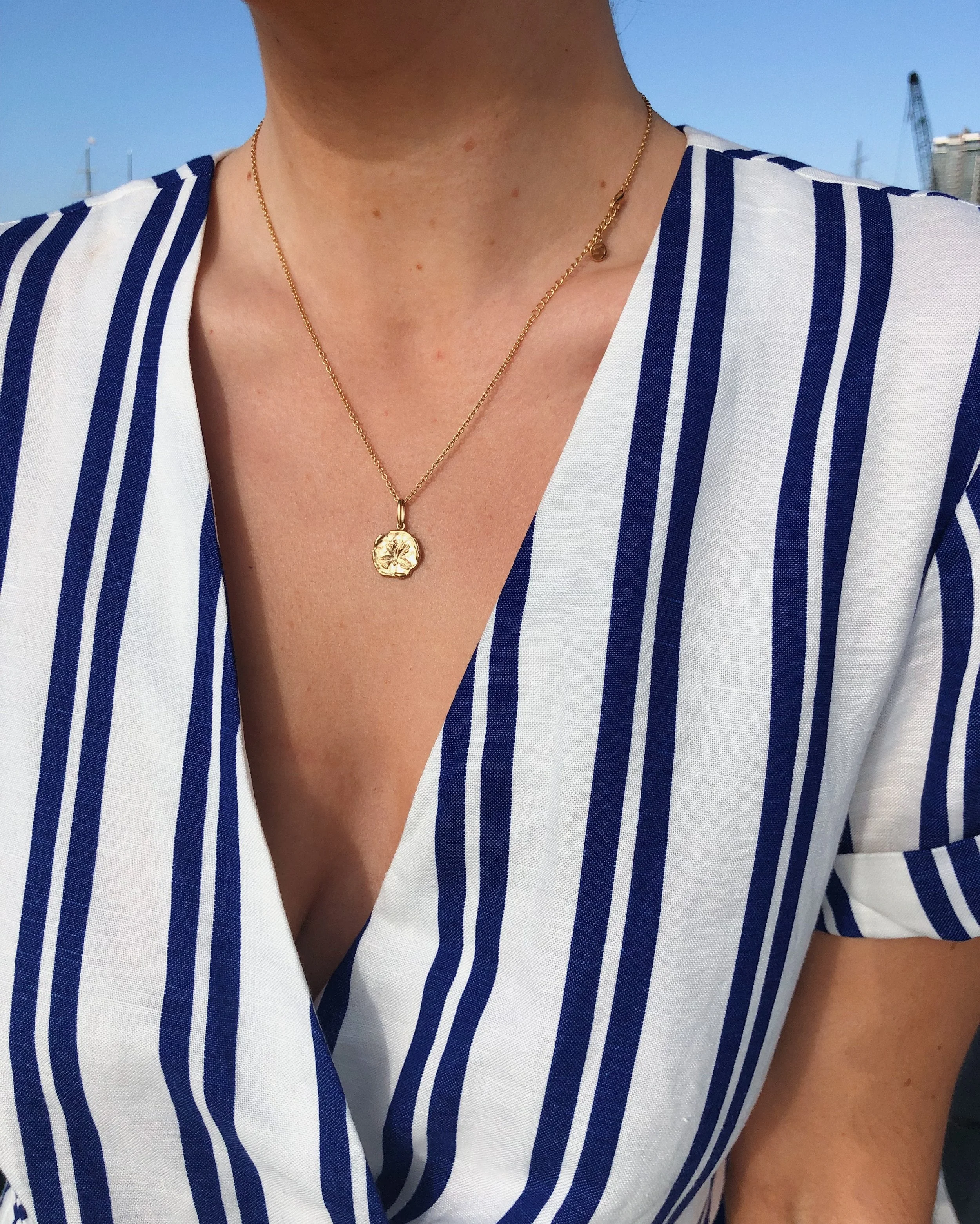 On a recent trip to San Diego, we took an amazing sunset sail. I donned this amazing L’Academie Tuscy Dress from Revolve which was perfect for the occasion. I originally saw it on one of my favorite influencers, Sammy Robinson, and feel in love with it! It’s a beautiful thick linen fabric with double blue stripes and front pockets. Gold jewelry is always a must, so I wore a new Floral Medallion Necklace from Mejuri.